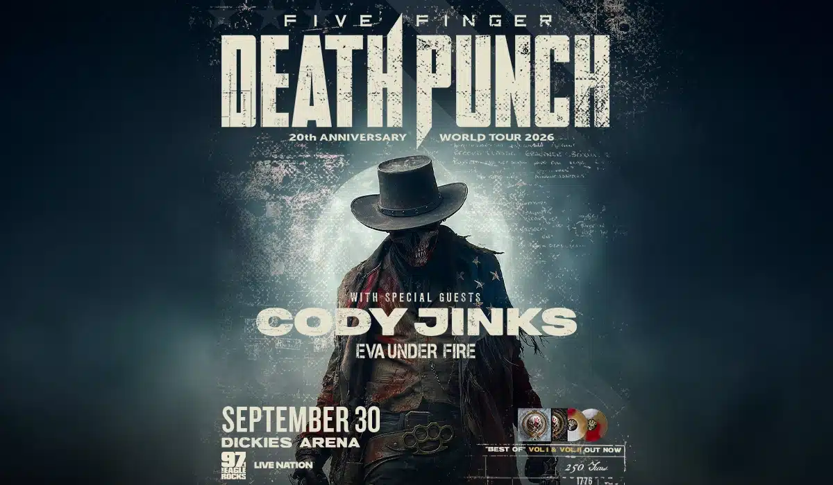 One of the world’s biggest hard rock bands, multi-platinum powerhouse Five Finger Death Punch announces the first leg of their 2026-2027 World tour. Produced by Live Nation, the massive 48-city tour will make a stop to Dickies Arena Wednesday, September 30 in Fort Worth.  Platinum-certified outlaw country musician Cody Jinks will join the tour as special guest and bring along his current album, “In My Blood” along with Eva Under Fire, who has earned critical acclaim, and will release a new album, “Villainous” in 2026.