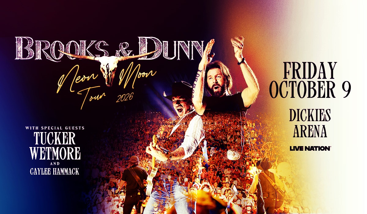Brooks & Dunn returns to Dickies Arena for their Neon Moon Tour 2026 with special guests Tucker Wetmore and Caylee Hammack on Friday, October 9, 2026.Ā