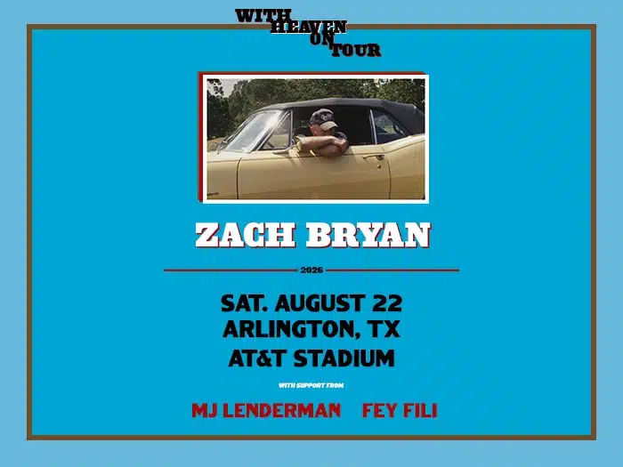 Zach Bryan is set to embark on his biggest international tour yet: With Heaven On Tour, a US and European run of dates kicking off March 7, 2026. He is stopping in Arlington on Sepetmber 22, 2026 with MJ Lenderman and Fey Fili.