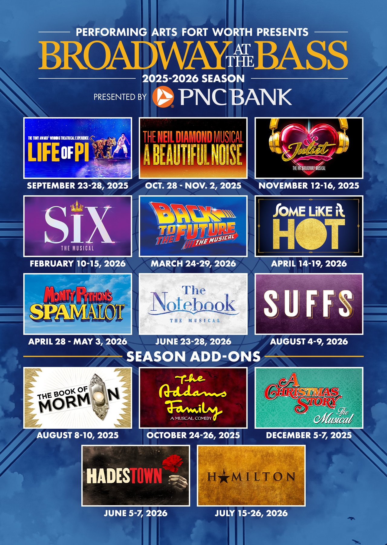 Discover a year of exceptional entertainment at Fort Worth’s iconic Bass Performance Hall. With a record number of 14 shows, the 2025-2026 Broadway at the Bass Season presented by PNC Bank has something for everyone!